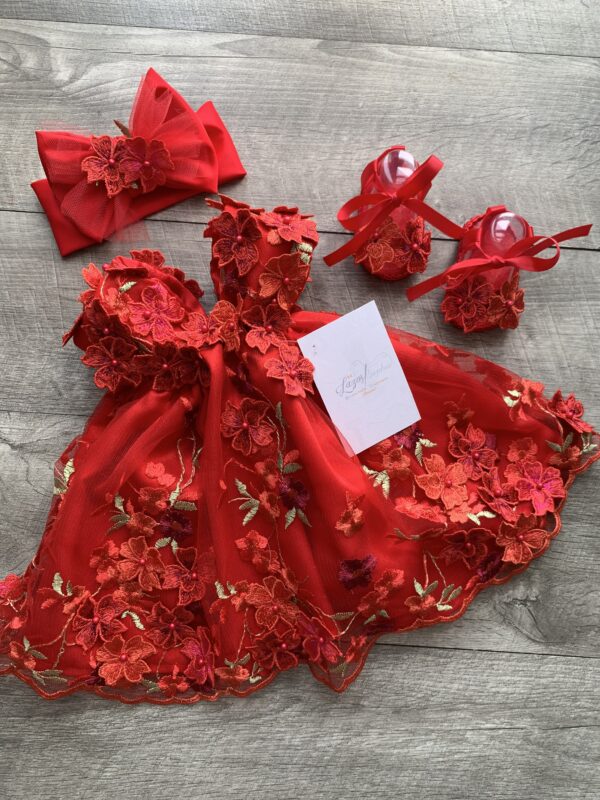 Vestido rojo floral tamaño recién nacida tiene elástico en la cintura trae Banda,chancletas y panticito.RECUERDA QUE LA MERCANCÍA NO TIENE CAMBIO!!!